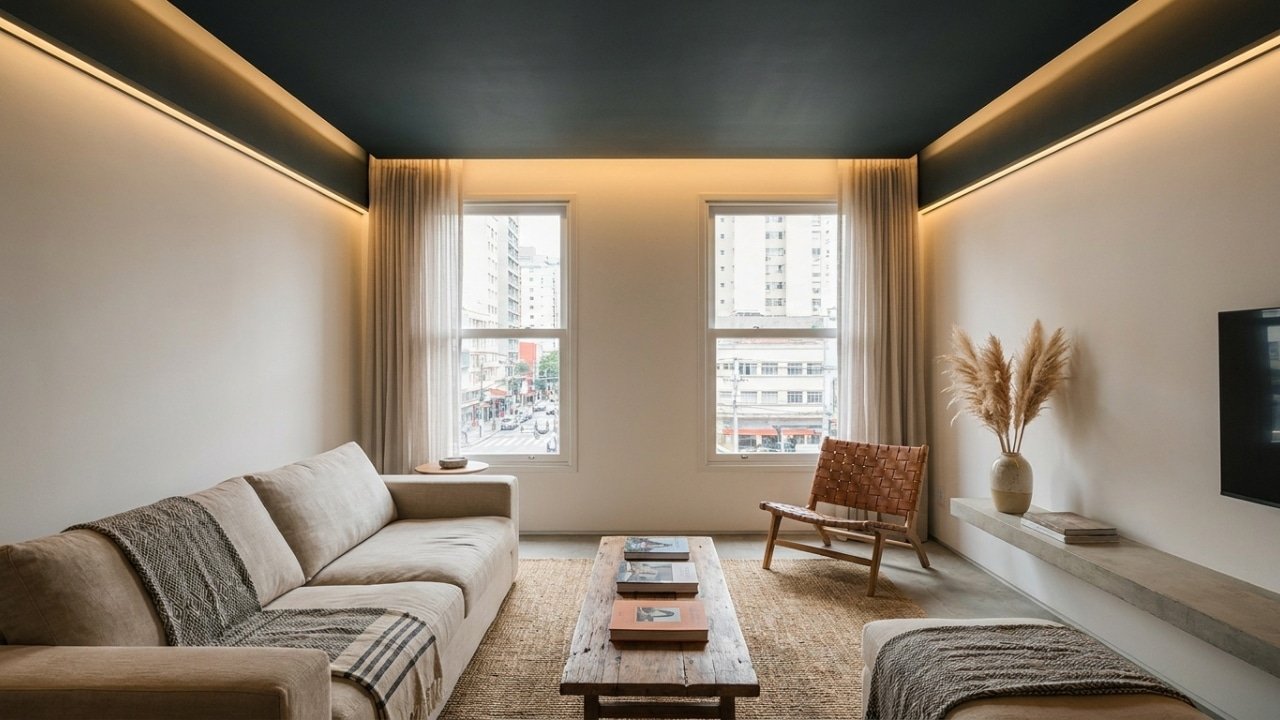 Além de ampliar visualmente o ambiente, a pintura do teto em cores escuras também pode adicionar um toque de elegância ao espaço. Essa abordagem é uma forma eficaz de transformar áreas que, à primeira vista, poderiam parecer limitadas em suas dimensões.