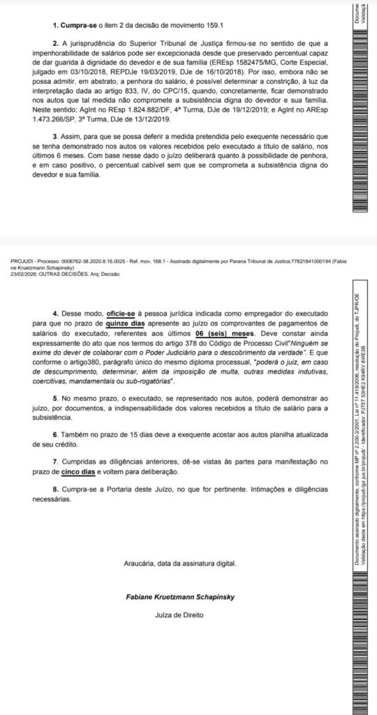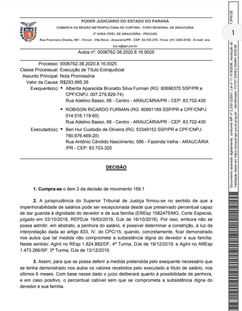 Justiça de Araucária determinou levantamento da renda de Ben Hur Custódio de Oliveira para avaliar possível bloqueio parcial do salário em ação de cobrança baseada em nota promissória.